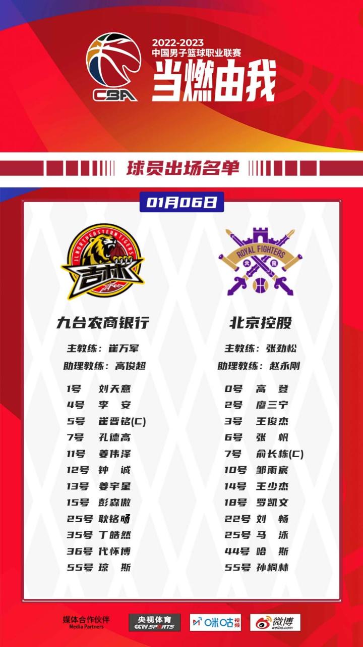 比赛中,九台农商银行主帅崔万军安排的首发阵容为:琼斯、姜宇星、姜伟泽、崔晋铭、李安。北控代理主教练张劲松安排的首发阵容则是:高登、张帆、邹雨宸、俞长栋、马泳。