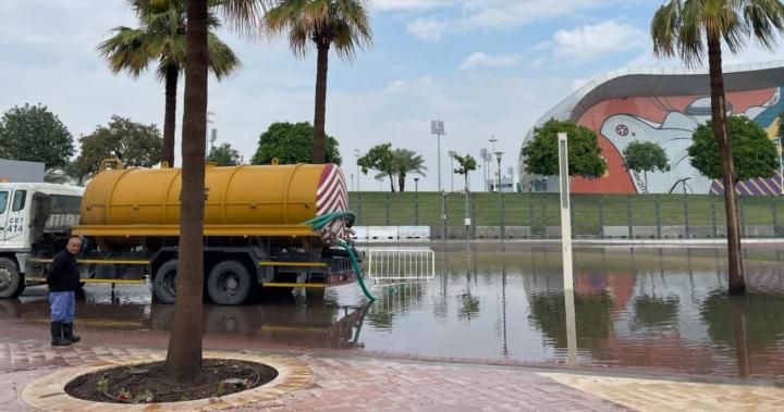 周六训练场的积水已经很深了,水坑又大又圆,抽水车出动帮忙。