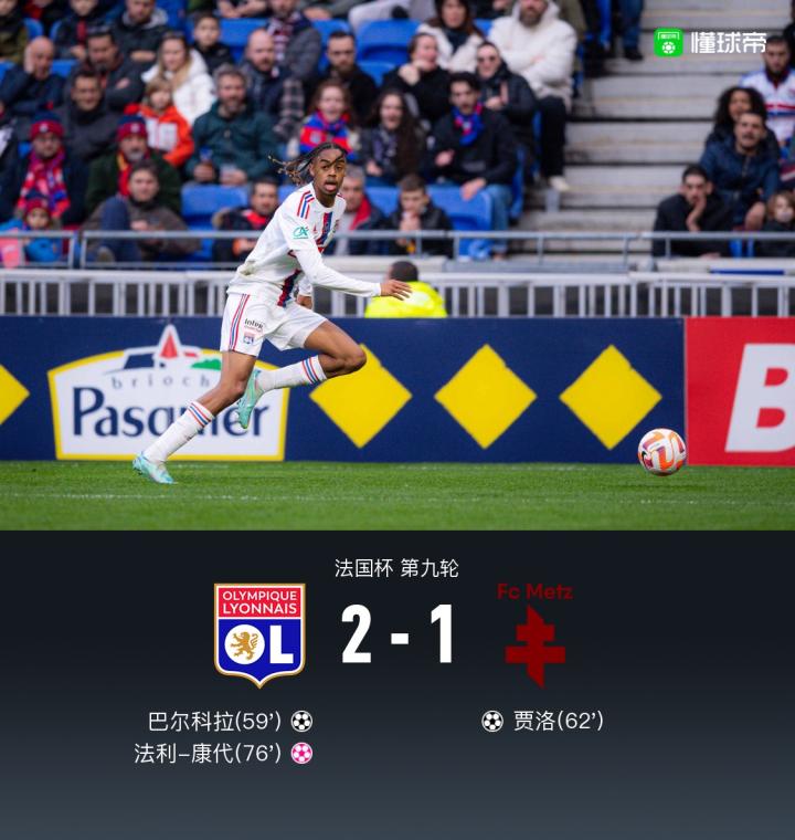 北京时间1月7日22:30,法国杯第9轮,里昂对阵梅斯。上半场,卡克雷、泰特制造威胁;下半场,穆萨-登贝莱助攻巴尔科拉破门,贾洛轰出世界波扳平,康代乌龙送礼,最终里昂2-1梅斯晋级。