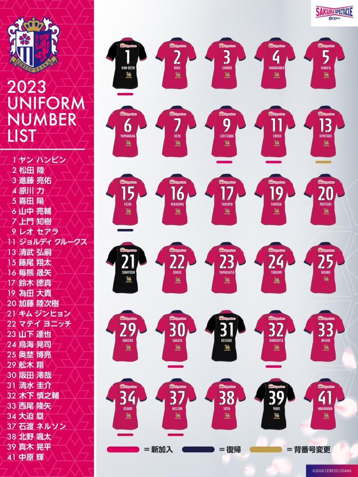 大阪樱花公布新赛季球队名单和号码。