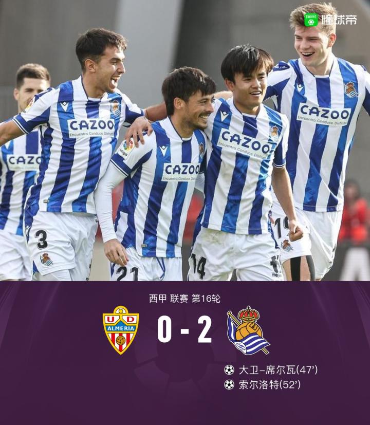 北京时间1月8日21:00,西甲第16轮,阿尔梅里亚主场对阵皇家社会。上半场,久保健英低射打偏,伊利亚拉门迪头球攻门顶高。下半场,大卫-席尔瓦小角度低射破门,索尔洛特抽射建功,最终,阿尔梅里亚0-2皇家社会。