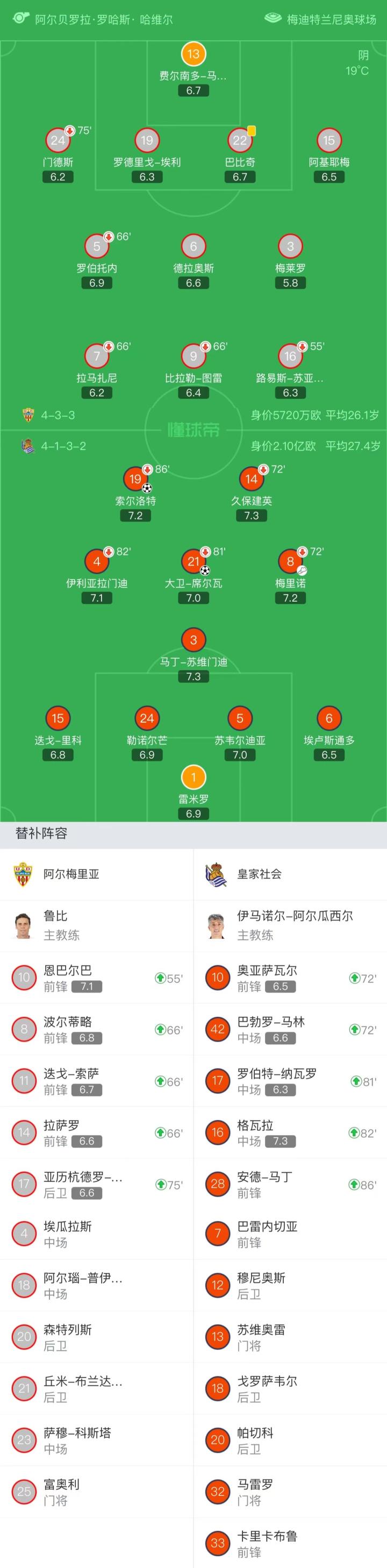阿尔梅里亚首发:13-费尔南多-马丁内斯、24-门德斯、19-罗德里戈-埃利、22-巴比奇、15-阿基耶梅、5-罗伯托内、6-德拉奥斯、3-梅莱罗、7-拉马扎尼、9-比拉勒-图雷、16-马尔科-米洛万诺维奇