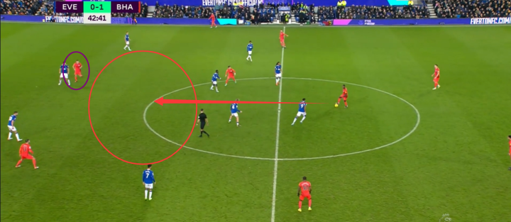 第三张:这张动图我想给读者强调:弗格森虽然以回撤策应为他的核心竞争力,但他却不失一位中锋应有的本领。他并不是所有时间都在回撤,此图中他的位置始终与中卫平齐,也就是我在上文也提到过的——压制对手防线高度。何为压制防线高度?我方顶在最前面的球员的位置便决定了对手后卫线的整体位置。如果我方箭头人员位置总是靠后,那么对手的防线便可以肆无忌惮的前提,以压缩本方球员的持球空间。当弗格森回撤时,两个边锋三笘薰和马希会顶在前方,压制对手。而两个边路球员回撤接球时,弗格森也可以做到压制中卫的效果。此球弗格森的站位给13号格罗斯拉扯出很大空间。我们也可以从下面这张图片看出弗格森作为箭头人员时的压制作用。