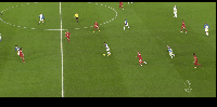 第一张:弗格森先是绕对手右中卫身前,插对手右中卫与右后卫的空间,但是队友没传。于是他回撤到本方中场位置的左肋部,但是这次队友也没传 。最后他再回到锋线压制对手防线高度。