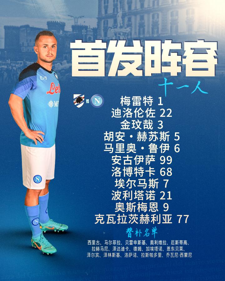首发 | 我那本轮客场对阵桑普多利亚的首发出炉。...那不勒斯足球俱乐部 @懂球帝2023-01-09 00:12首发 | 我那本轮客场对阵桑普多利亚的首发出炉。小胡安、鲁伊和埃尔马斯入选11人阵容,新援贝雷申斯基在替补席待命!展开更多
