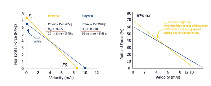 这个测试可以帮助检测SSP曲线的哪些要素需要改进,以便制定一个纠正缺陷的计划。例如,如下图所示,两名橄榄球运动员进行了30米冲刺测试,他们力量值和执行时间接近。对于这两名球员来说,类似的过程可能会在他们身上产生次优的适应性。然而,如果我们分析这个曲线的所有组成部分,可以看到,球员B训练重心应该放在最大力量上,而球员A在加速时表现出较低的力量应用效率,因此训练应该集中在改善速度上。