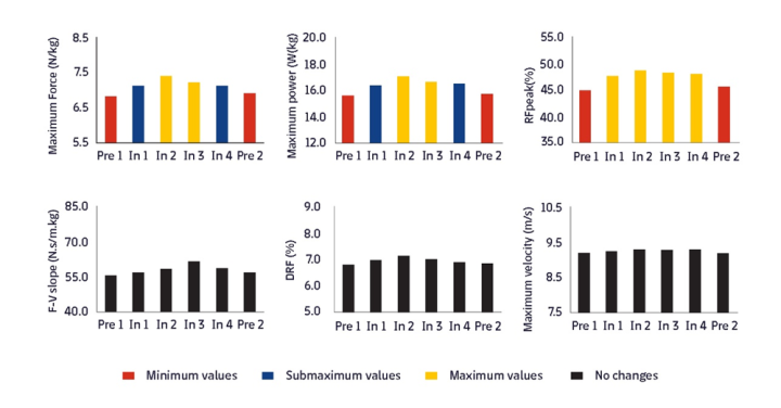 结果表明,SSP剖面的3个变量在该赛季变化显著:最大强度(F0)、最大功率(Pmax)和力比最大值(RFpeak)。而其他3个变量:最大速度(v0)、强度-速度斜率(FVslope)和决定强度比随加速度增加而减小的变量(DRF,水平力与合力之比)则没有明显变化。从下图可以看出,F0、Pmax和RFpeak在赛季中期(2和3)达到最大值,但在赛季的最后阶段下降。由于F0和RFpeak是与最大加速能力相关的变量,因此这些结果表明,优秀的足球运动员应该进行特定的训练来提高冲刺表现,从而防止在赛季结束时与最大加速能力相关的变量下降。此外,F0的降低不仅从运动表现的角度来看很重要,而且因为不同的研究表明,F0降低可能与腘绳肌损伤的风险增加有关。