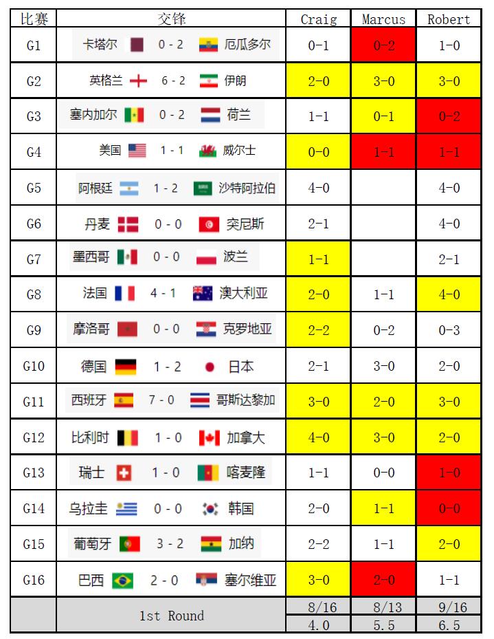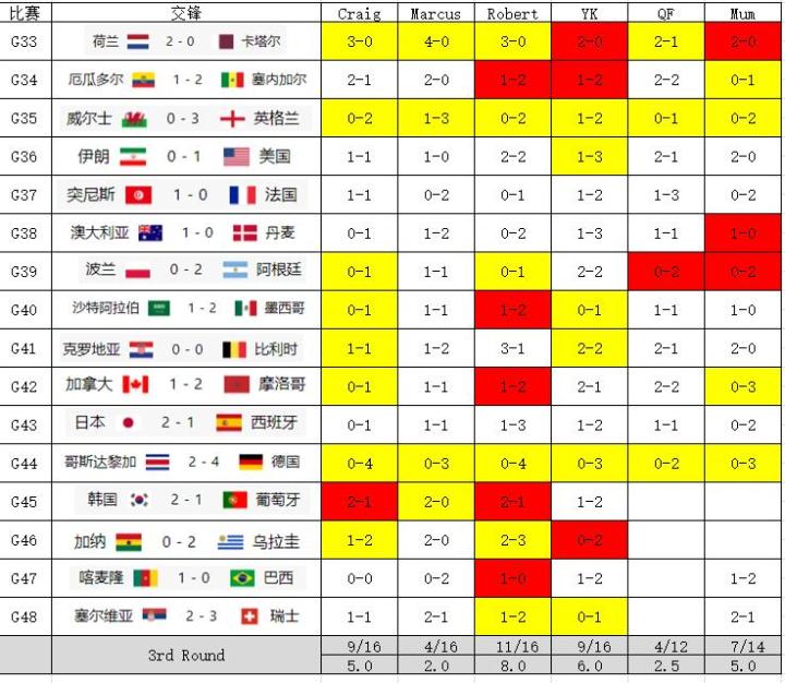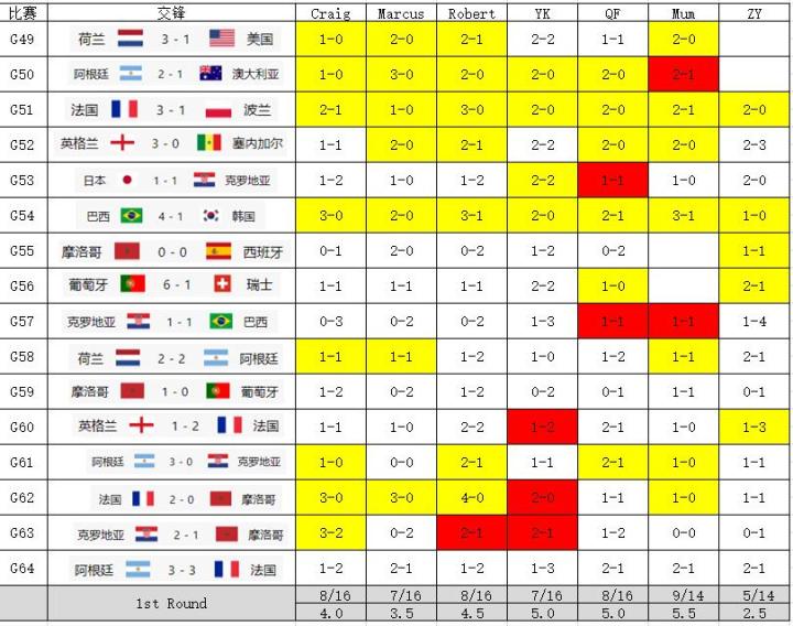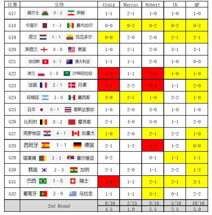 淘汰赛阶段,我预测对8场比赛胜负,没有一场猜对比分,4.0分。Marcus猜对7场胜负,同样没有一场比分猜对,3.5分。Robert也不如小组赛阶段神勇,猜对8场胜负,只预测对1场结果,4.5分。YK和他老婆QF分别预测对7场和8场胜负,各拿到5.0分,其中YK是淘汰赛阶段预测对比分最多的,一共三场。ZY猜了14场,5场预测对胜负,2.5分。