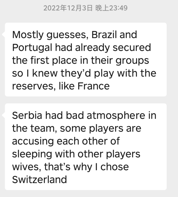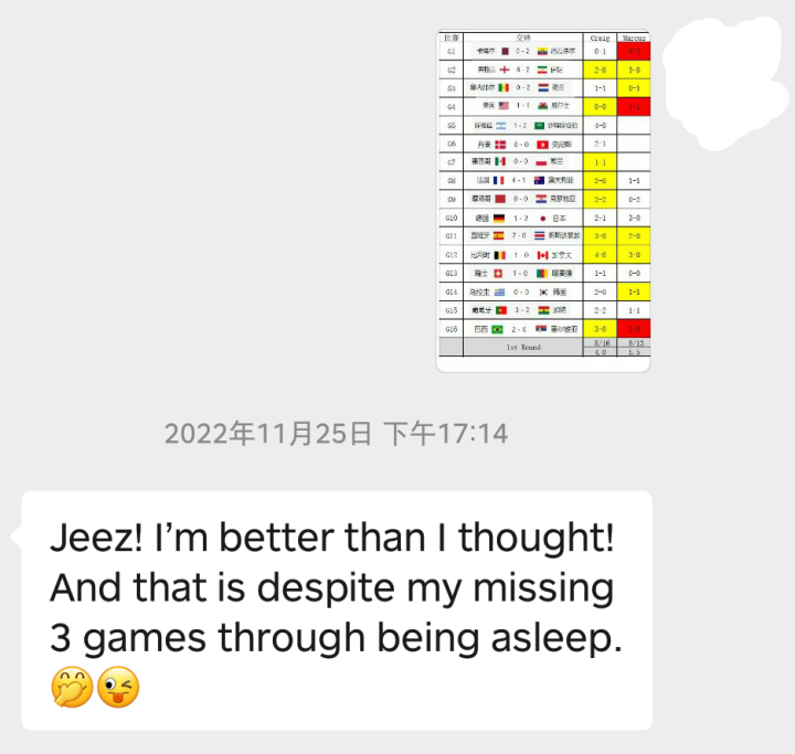 虽然不实际投注了,还是可以和朋友互动,当做游戏乐呵一下。于是我联系了每次大赛一起乐呵的球迷朋友,每个比赛日前互发预测结果。我们的规则,猜对胜平负得0.5分,猜对比分得1分。