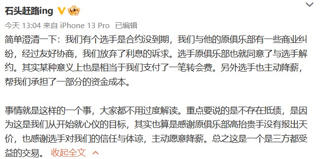 简单澄清一下:我们有个选手是合约没到期,我们与他的原俱乐部有一些商业纠纷,经过友好协商,我们放弃了利息的诉求。选手原俱乐部也就同意了与选手解约。其实某种意义上也是相当于我们支付了一笔转会费。另外选手也主动降薪,帮我们承担了一部分的资金成本。