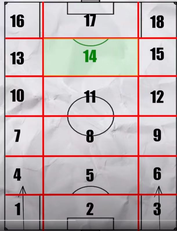 在“18区”球场的划分体系下,有一个14区,在全世界的足球分析师眼中,这个区域,被称作“黄金十四区”。根据数据统计,该区域是所有区域中创造进球机会最多的区域(并不一定是直接得分),有多达75%~80%的进球源自于这个区域。当然除了对进球的直接影响外,“黄金十四区”的最大优势还是此区域拥有着极为出色的传球角度,在此区域的球员不仅可以直接完成远射攻门,同时还可以为队友送出极具杀伤力的渗透性传球,或者将球分给边路通过边中结合完成进攻。不过,随着现代足球的发展,黄金十四区也逐渐成为了大多数球队重点把守的区域。因此,如何利用好本区域是越来越多教练需要考虑的。