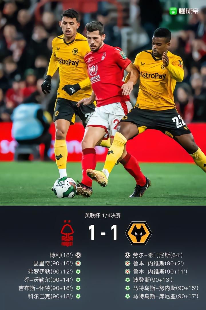 北京时间1月12日3:45,英联杯1/4决赛,诺丁汉森林迎战狼队。上半场,博利门前乱战捅射破门,诺丁汉森林1-0领先。下半场,库尼亚横传,希门尼斯轻松破门,狼队1-1扳平比分。点球大战迪恩-亨德森最后一轮扑出点球,帮助球队取胜,全场比赛结束,诺丁汉森林点球5-4战胜狼队晋级4强。