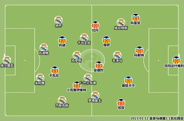 楚阿梅尼、阿拉巴和门迪有伤在身,卡马文加和纳乔出现在首发阵容中,安切洛蒂安排罗德里戈首发,要求F-巴尔韦德靠前支援锋线,希望以凌厉的攻势来缓解后场的压力。在世界杯前的比赛中,安切洛蒂便在多场比赛中使用其拿手的442/424阵型,以堆积前锋的方式解决锋无力问题。本泽马伤愈复出后状态一般,安切洛蒂延续“四前锋”的操作是顺理成章的。