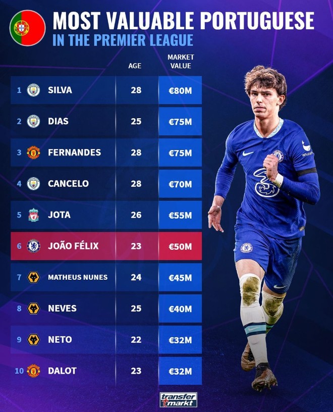 菲利克斯正式租借加盟切尔西,足球数据网站德转盘点了在英超踢球的葡萄牙球员身价top10。其中,B席以8000万英镑居首,B费第三,菲利克斯第六。