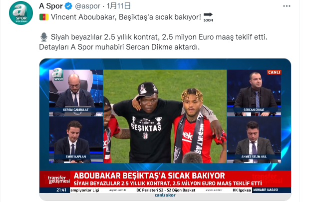 据土耳其记者塞尔詹·迪克梅在一档电视栏目中表示:努尔切比已向阿布巴卡尔开出一份为期2年半的合同,相关的薪资条款也令喀麦隆人感到满意。一旦阿布巴卡尔完成转会,那韦霍斯特加盟曼联以及C罗的注册问题,都能迎刃而解。