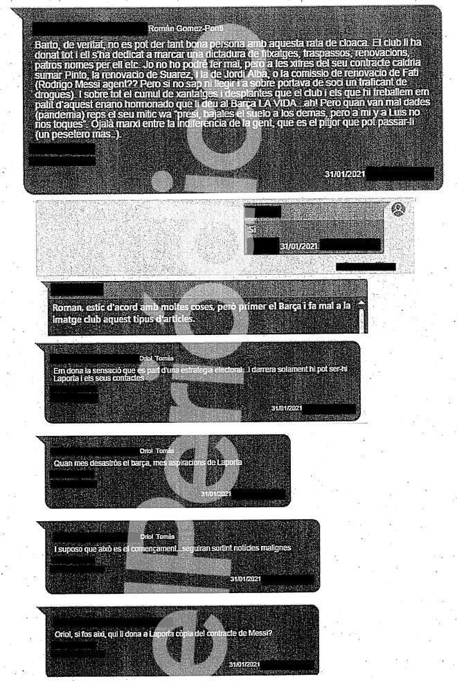 近日,《每日体育报》披露了加泰警方对梅西和皮克合同泄露的证据内容,前巴萨CEO奥斯卡-格劳和前法律服务负责人罗曼-戈麦斯-庞蒂是泄露梅西和皮克合同的幕后黑手,目前他们与巴托梅乌的聊天记录已曝光,其中包含一些对梅西的辱骂信息。