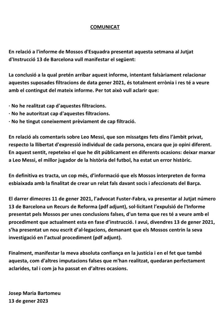 北京时间1月13日,前巴萨主席巴托梅乌针对此前梅西、皮克等人合同泄露一事发布了新闻稿。相关阅读:【巴托梅乌否认向媒体泄露梅西的合同,并认为这诋毁了自己形象】
