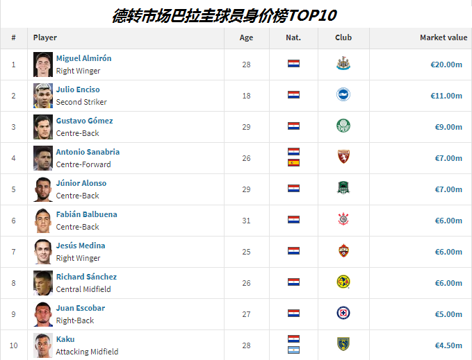 阿尔米隆和恩西索也成为了目前仅有的两名身价超过1000万欧元的巴拉圭球员。而另外几名效力于五大联赛的球员有西甲赫塔菲后卫阿尔德雷特、西甲加的斯后卫阿萨门迪亚、意甲都灵的前锋萨纳夫里亚。