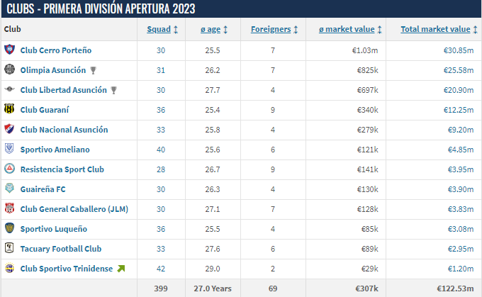 巴拉圭足球甲级联赛在新赛季有12支球队,联赛总身价约1.23亿欧元,联赛总身价落后于乌拉圭、厄瓜多尔、秘鲁、智利等国的联赛。其中身价最高的是阿尔米隆的母队波特诺山丘,这家始建于1912年的巴拉圭豪门目前的总身价为3085万欧元,山丘也是目前巴拉圭甲中仅有的身价超过3000万欧元的球队。