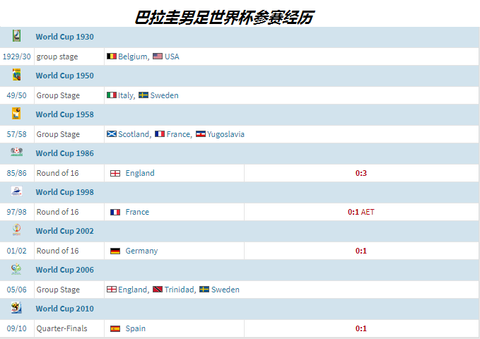 此后乌拉圭男足再未能晋级世界杯决赛圈。巴拉圭在卡塔尔世界杯的南美区预选赛中仅领先委内瑞拉和玻利维亚,排在预选赛倒数第三。