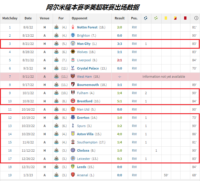 阿尔米隆在2022年10月20日到12月26日期间连续6场比赛都有进球或者助攻,帮助球队取得了一波六连胜,纽卡在本赛季有阿尔米隆进球或者助攻的9场联赛中保持着8胜1平的强势成绩。
