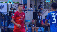 这是一场泰国第三级别的联赛,曼谷FC队的6号球员,在带球即将出边界时,被对方33号蓝队球员暗算了一下。
