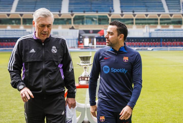 西超杯决赛前一天,哈维和安切洛蒂在奖杯前举球衣合影ETChalmers @懂球帝2023-01-14 17:32西超杯决赛前一天,哈维和安切洛蒂在奖杯前合影。北京时间1月16日凌晨3点,西超杯决赛,皇马和巴萨将争夺冠军。按照传统,赛前一天,巴萨主帅哈维和皇马主帅安切洛蒂在奖杯前举着球衣合影,两人还握手致意。展开更多