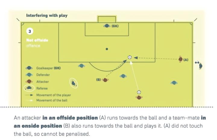 除此之外,IFAB还有关于这种情况的范例:处于越位位置的进攻队员A向球跑去,处于不越位位置的队友B也向球跑去,并将球射出。由于A没有触球,所以不能被判为越位。