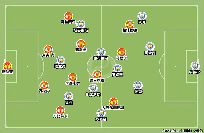 曼联的两翼进攻严重不平衡,曼城同样存在着明显的左倾。擅长在中路为哈兰德送脚下球的京多安没有出场,伯纳多-席尔瓦状态不佳,曼城只能强攻两翼。德布劳内状态不在高点,弗雷德对其形成了很好的限制,曼城只能主攻左路,福登需要面对身体素质出众的万比萨卡,表现同样比较挣扎,滕哈格的针对性防守部署非常成功。