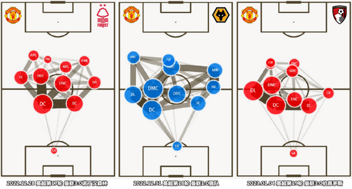 (图)穆里尼奥和索尔斯克亚设计的反击线路简单粗暴,滕哈格的球队在守转攻阶段的传递更耐心,找到空当后会迅速依靠向前传球打开局面。