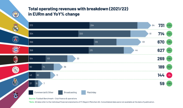 除此之外,拜仁(5%)、AC米兰(16%)、阿贾克斯(51%)以及土超冠军特拉布宗体育(36%)在2021-22赛季都实现了增长,仅有波尔图收入下滑(-6%)。