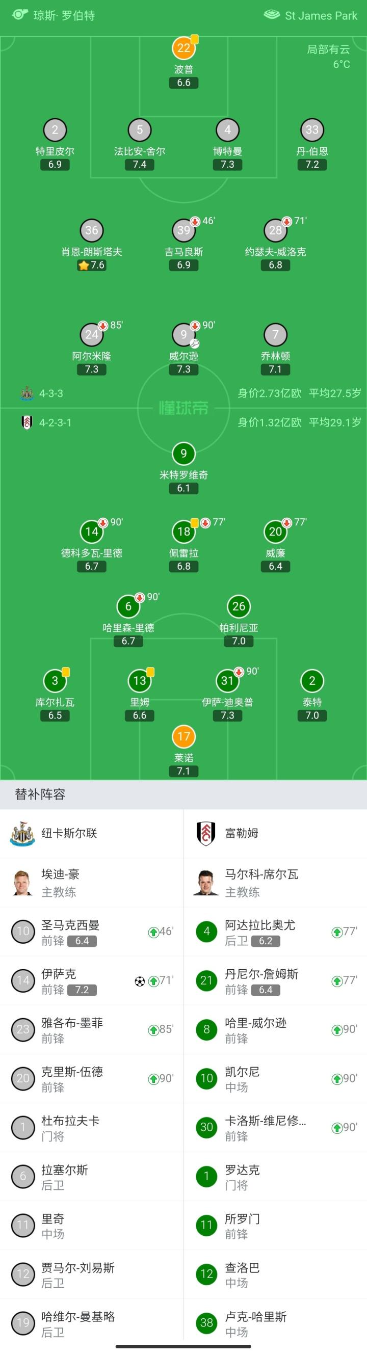 纽卡首发:22-波普、2-特里皮尔、5-法比安-舍尔、4-博特曼、33-丹-伯恩、36-肖恩-朗斯塔夫、39-吉马良斯、28-约瑟夫-威洛克、7-乔林顿、9-威尔逊、24-阿尔米隆