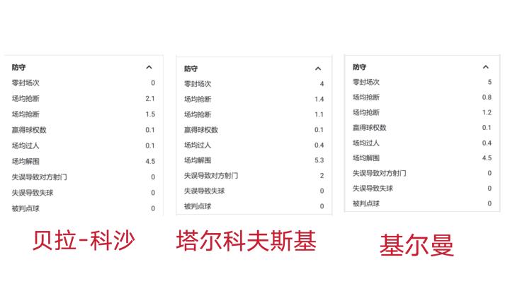 与保级对手后卫线的防守数据对比:贝拉-科沙(图1);塔尔科夫斯基(图2)基尔曼(图3)
