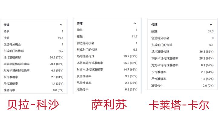 南安普顿三个中卫传球数据对比:贝拉-科沙(图1);萨利苏(图3);卡莱塔-卡尔(图3)