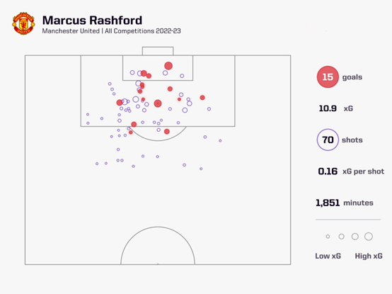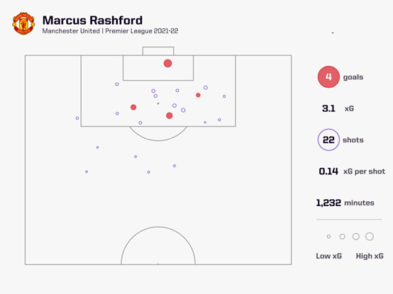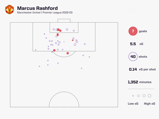 在2019/20赛季,拉什福德的进球率为每90分钟0.37球。本赛季,这个数字上升到了每90分钟0.47球。在整个2019/20赛季,拉什福德在六码区打进两球。2022-23赛季过半,他已经超过了这个数字,他正在更频繁地进攻禁区。