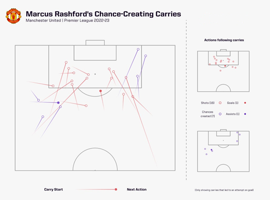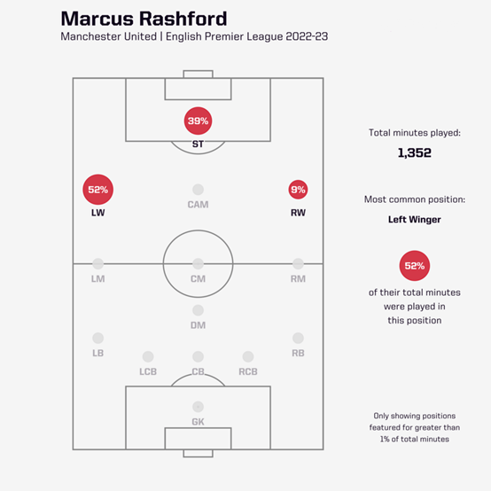 拉什福德的出色的表现还来自于他在进攻中所占据的位置。如前所述,本赛季他主要在滕哈格手下踢左路。