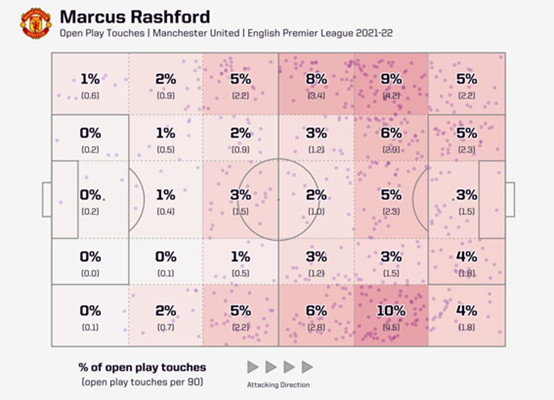 他在2021/22赛季的触球地图看起来分散,缺乏特点,拉什福德在两个边路和中路都有比赛。这感觉就像是曼联队从索尔斯克亚到朗尼克混乱不堪的直接产物,后者在24场比赛中只赢了10场联赛。