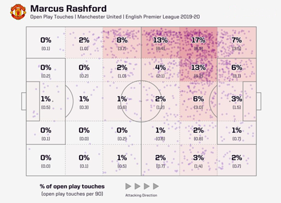25 岁的拉什福德现在有一个更好的地方,那就是他在禁区内的表现。 它并不像 2019 年那样仅限于左侧。 相反,拉什福德现在在禁区左侧和中部的位置均等,都有差不多5%。 此外,本赛季拉什福德 78% 的射门来自禁区内,而 2019/20 赛季这一比例仅为 59%。