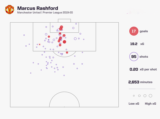 对比以下两个赛季,有趣的是,虽然拉什福德的每次射门的xG值是0.14,但他本赛季的射门次数几乎是过去的两倍。