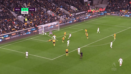 他从边路内切传给B费,同时发现狼队防线的空当,然后冲进去。
