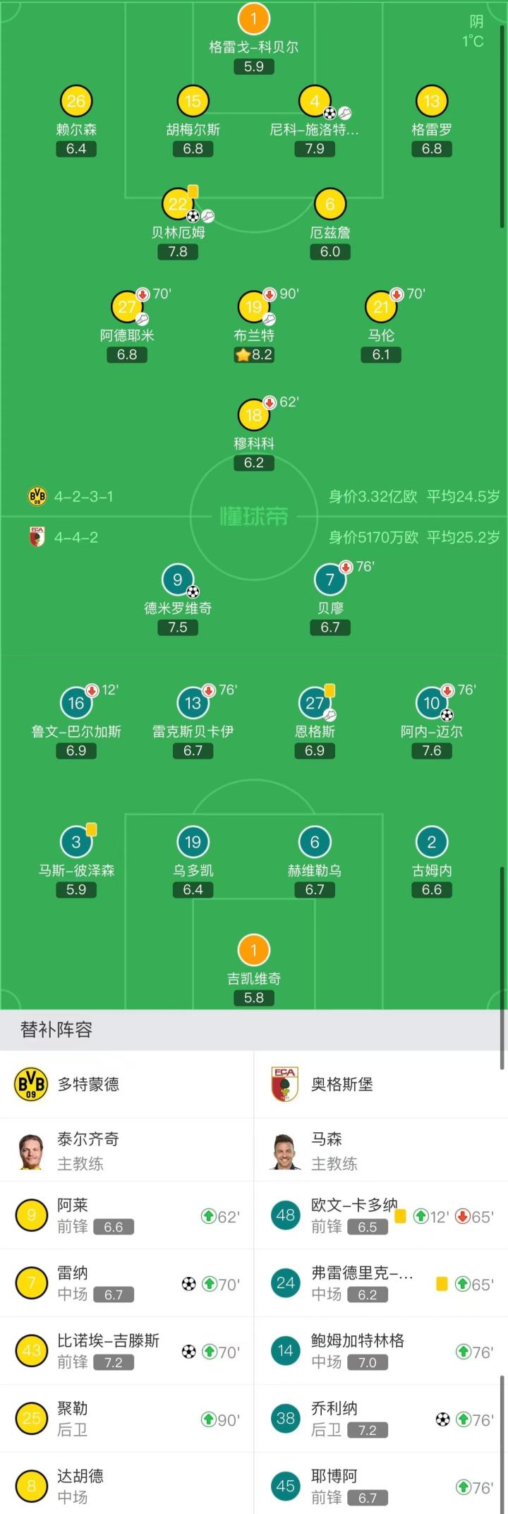 多特蒙德首发:1-格雷戈-科贝尔、4-尼科-施洛特贝克、6-厄兹詹、13-格雷罗、15-胡梅尔斯、22-贝林厄姆、26-赖尔森、27-阿德耶米(70'7-雷纳)、18-穆科科(62'9-阿莱)、19-布兰特(90+1'25-聚勒)、21-马伦(70'43-比诺埃-吉滕斯)