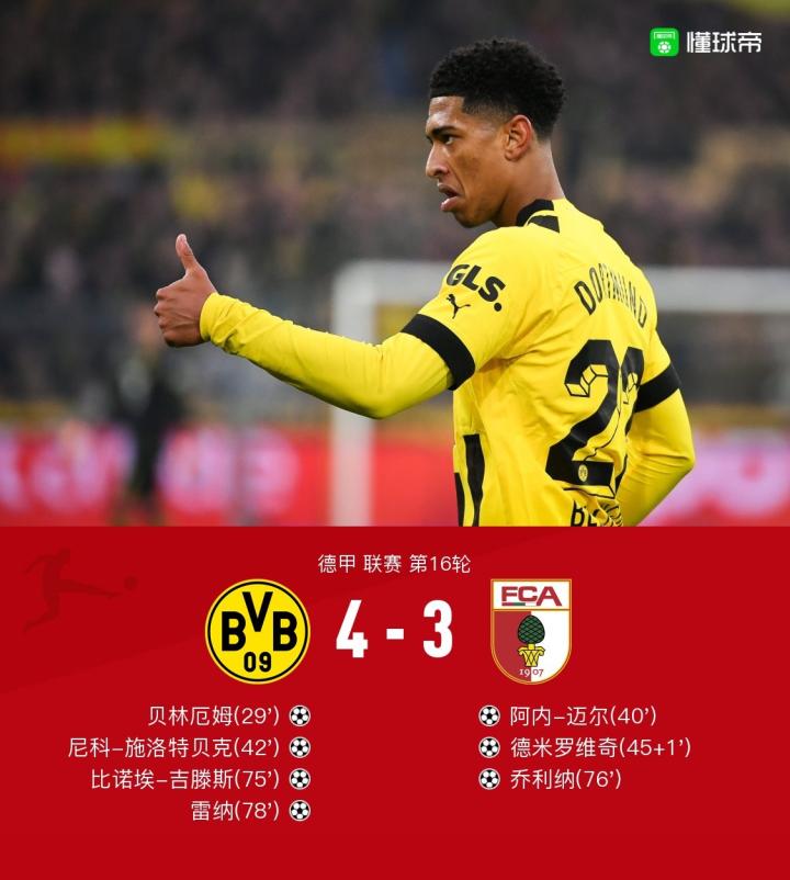 进球大战!多特4-3奥格斯堡,贝林厄姆、比埃诺-吉滕斯破门