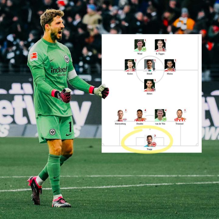 踢球者评选的德甲16轮最佳阵容,法兰克福守门员特拉普入选。(本赛季第三次,这一场也是特拉普德甲250次出场里程碑之战) 完整阵容(4-1-3-2) 守门员:特拉普(法兰克福) 后场:哈尔斯滕贝格(RB莱比锡)、多克希(柏林联合)、范德文(沃尔夫斯堡)、特里梅尔(柏林联合) 中前场:斯希里(科隆)、马伊纳(科隆)、施廷德尔(门兴格拉德巴赫)、凯因茨(科隆) 前锋:温德(沃尔夫斯堡)、蒂格斯(科隆)