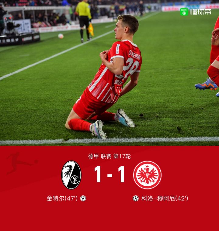 北京时间1月26日3:30,德甲第17轮,弗赖堡主场对阵法兰克福。上半场,霍勒抽射偏出,堂安律铲射打偏,科洛-穆阿尼打破僵局。下半场,金特尔头球破门,格雷戈里奇抽射打偏,最终,弗赖堡1-1法兰克福。
