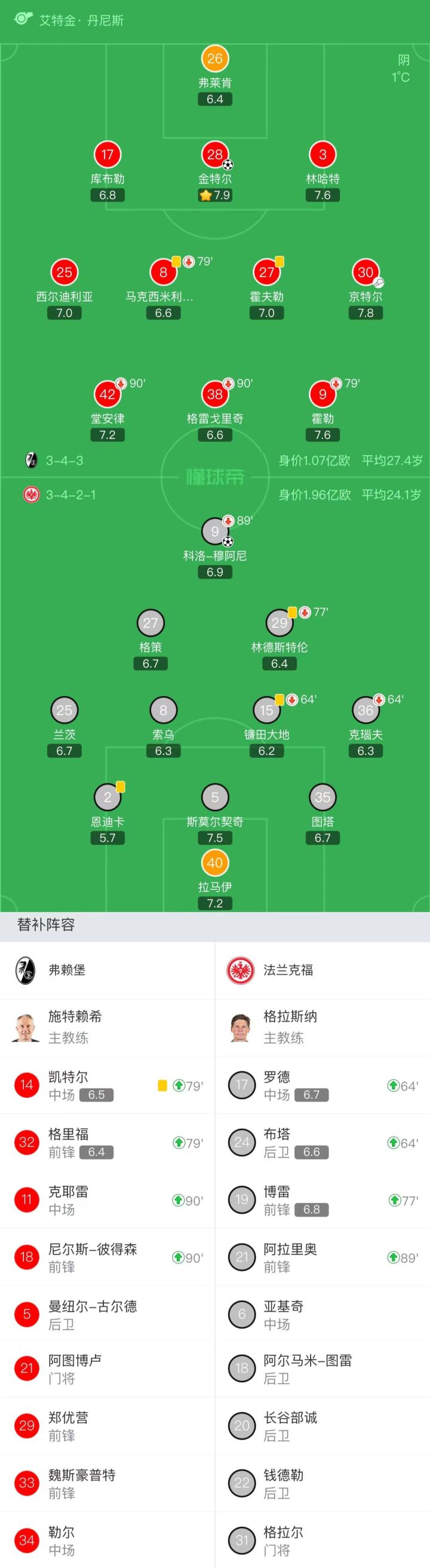 弗赖堡首发:26-弗莱肯、17-库布勒、28-金特尔、3-林哈特、25-西尔迪利亚、8-马克西米利安-埃格施泰因、27-霍夫勒、30-京特尔、42-堂安律、38-格雷戈里奇、9-霍勒