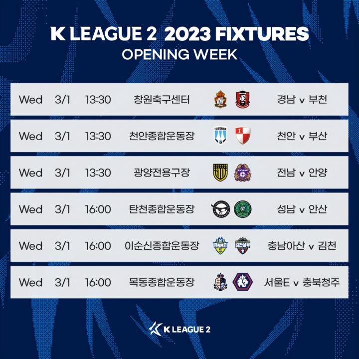 在新赛季K1联赛于2月25日开幕的消息公布后,迟迟没有等来K2联赛开幕的消息,如今这个悬念也有了答案!1月26日上午,韩国足球职业联盟正式对外公布了新赛季K2联赛的赛程安排,由于今年多了两支球队加盟且还是单数,因此新赛季K2联赛依旧会有一支球队单轮轮空,而单轮的总场数从5场变为了6场!2023赛季的K2联赛将在3月1日(晚于K1联赛一周)举行,这个日子是周三,并非周末,也是K2联赛历史上第一次在非周末打响赛季揭幕战!当然3月1日是韩国法定的节假日(三·一运动纪念日),因此选择这一天开幕,也有特殊的意义。六场比赛同日开打,三场比赛在第一时间段同时进行,分别是:庆南FC对富川FC1995,天安城对釜山IPark,全南天龙对FC安养。此外,以往的“周一K联赛”模式将继续进行,每支球队都会轮到一场“周一赛事”,赛季第一场“周一K联赛”对阵双方是FC安养和城南FC的“京畿德比”。常规赛总共39轮,39轮结束后,根据排名将在11月29日展开季后赛的争夺。今年的升降级规则和去年一致,第一名直升,第二名打K1倒数第二的附加赛,季后赛关键打K1倒数第三的附加赛,最终决出升级名额。新赛季的K2联赛,因为球队的丰富多彩,将足够精彩!