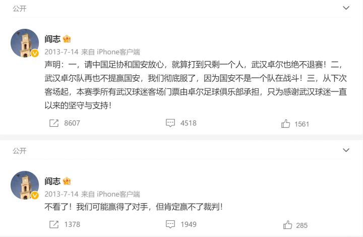 在接手武汉足球后,阎志在很长一段时间内都对这支球队格外关心和关注,这一点从他早些年微博发文就可见一斑。