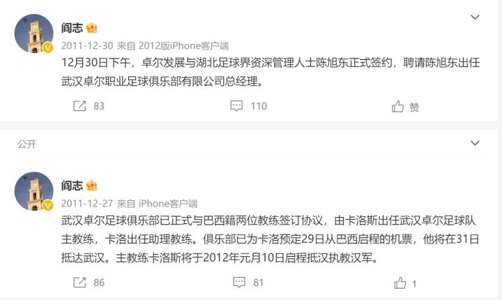 在武汉卓尔成立伊始,很多教练组和球员聘用的信息更新都是在阎志的个人微博上发布。