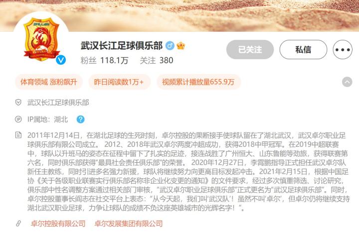 无论是在武汉长江解散公告还是官方微博的简介中,都能清晰地看到这样一段话:“2011年12月14日,在湖北足球的生死时刻,卓尔控股的果断接手使球队留在了湖北武汉,武汉卓尔职业足球俱乐部有限公司成立。”这段话一点也不夸张,只是当时的情况比这段话所描述的更为复杂和惊险。