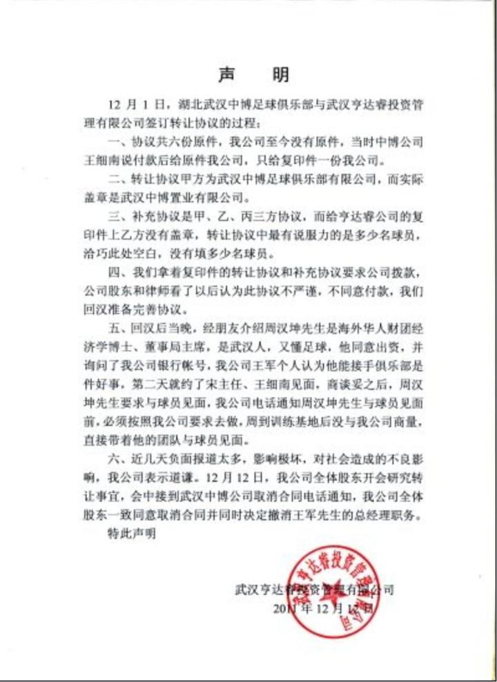 然而仅仅5天后,亨达睿发布公告称,周汉坤并非亨达睿投资人,并且确认武汉中博与亨达睿的转让协议取消。就这样,一次看似已经板上钉钉的俱乐部转让以闹剧收尾。